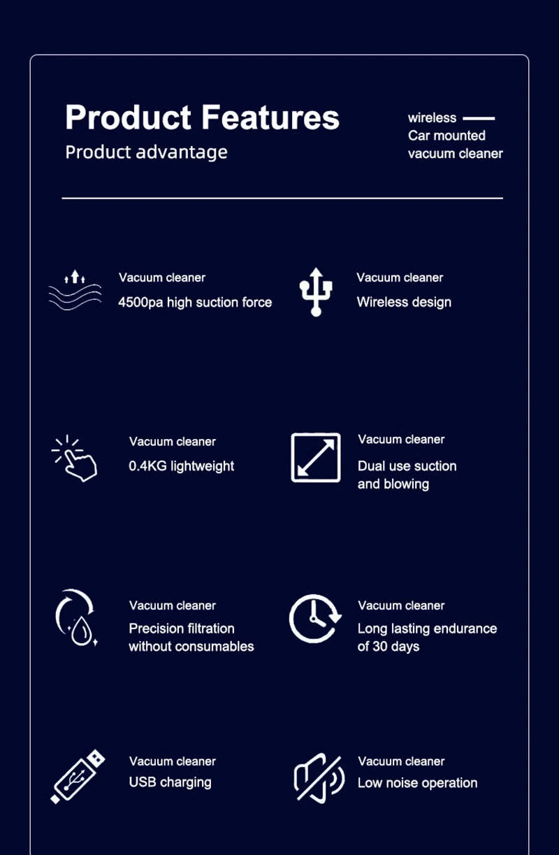 1. Aspirateur multifonctionnel : l'aspirateur peut être utilisé pour nettoyer les zones difficiles d'accès. L'aspirateur à main peut être un aspirateur pour ordinateur portable, un aspirateur de bureau, un aspirateur à main pour voiture, piano, animalerie, Nettoyage de bureau, etc.